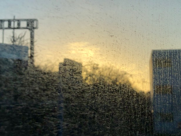 The sun is rise over Luton airport as I begin my journey. But the scratches on the bus windows make the beauty of creation blurry
