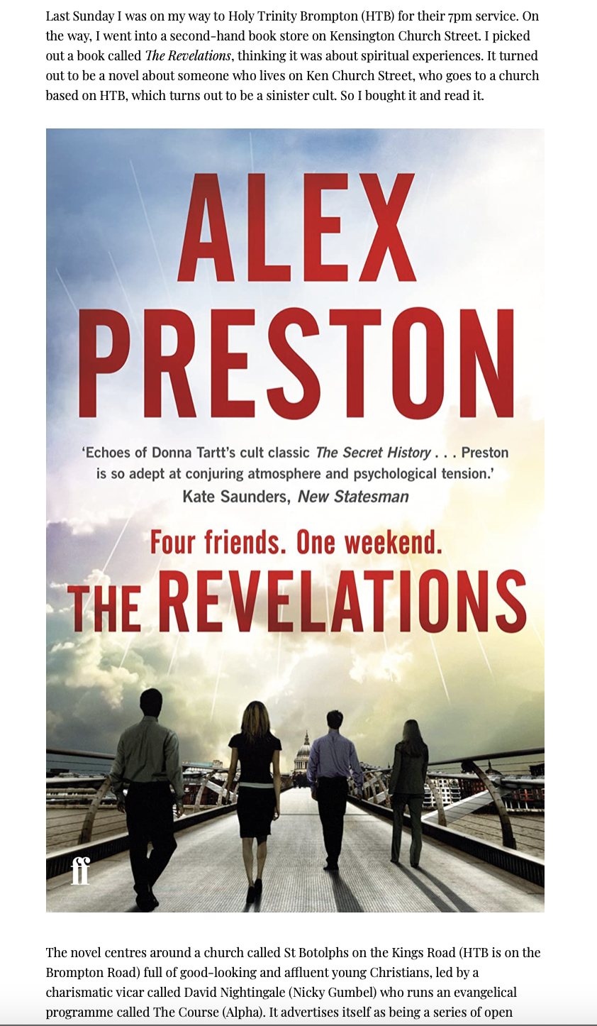 Journalist Jules Evans makes an interesting defence of HTB/Alpha in an article entitled: ‘Is Alpha and HTB as bad as Alex Preston says?.’ Preston is a novelist who has written a book ‘inspired by his experience of doing Alpha’ which portrays ‘The Course’ as a sinister cult. Evans makes a sympathetic defence of Alpha, HTB and ‘Humble Gumbel’ in particular who he rightly sees is not at all like Preston’s money-grabbing, egoist and narcissistic central character David Nightingale. So Evans’ summary of the sexual ethic he experiences at HTB as an Alpha participant/church attender makes an interesting read: