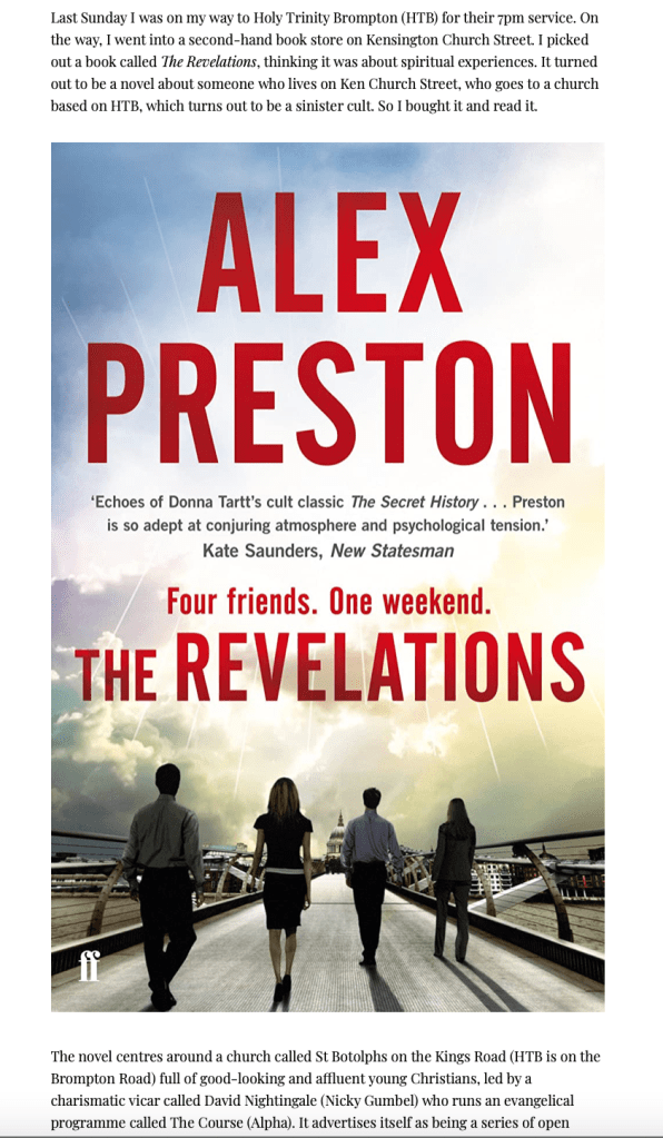 As for the general sexual climate of the church, Preston may have a point that the pretty girls of HTB draw in men, siren-like, to their salvation (or destruction, depending on your viewpoint). That’s often been the way in Christianity, and in other communities (how many men joined protest movements hoping for a shag?). Two guys in my group did the course because their Christian girlfriends asked them to. That’s not weird: people prefer to marry someone who shares their metaphysics, otherwise you’re basically living in different realities. Neither of them converted.