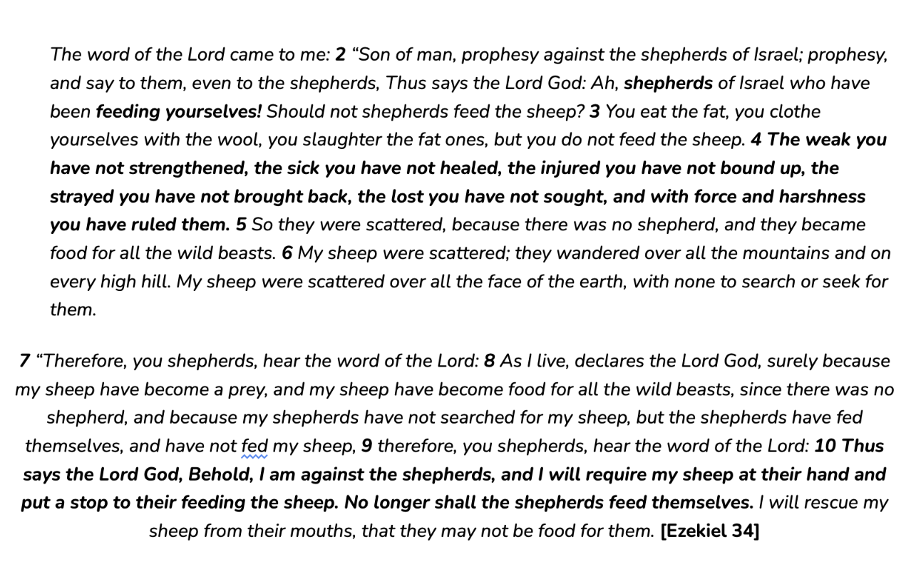 The very people who are supposed to be feeding the sheep, preserving the sheep for the master, saving the sheep from danger have the sheep ‘in their mouths’.