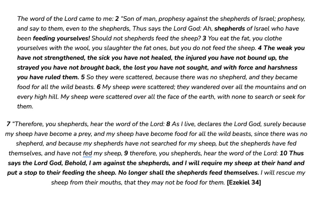 Ezekiel, the prophet sent to his own people, who needs a ‘forehead of flint’ to even talk to them, turns his fire in Chapter 34 on the spiritual leaders of his day. He accuses them of running a spiritual meat market.