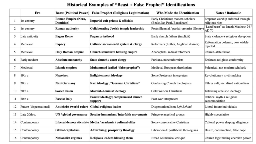 So Emperor Nero, twentieth-century totalitarian regimes and even modern ideological movements can all be genuine manifestations without exhausting the prophecy – operating under the ‘spirit of the beast’ or the ‘spirit of the false prophet.’